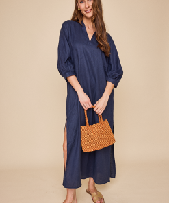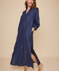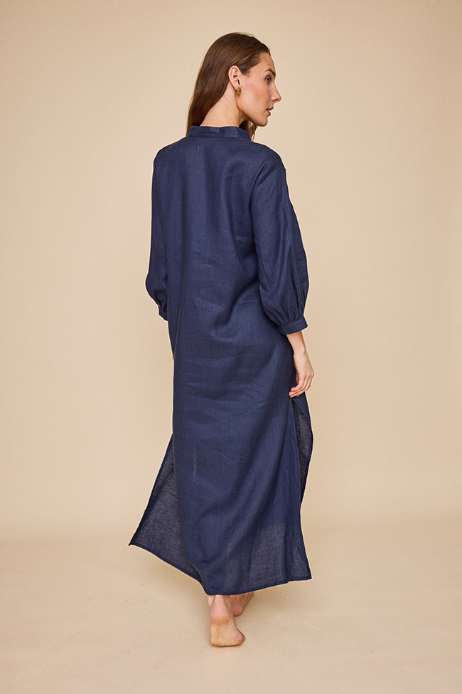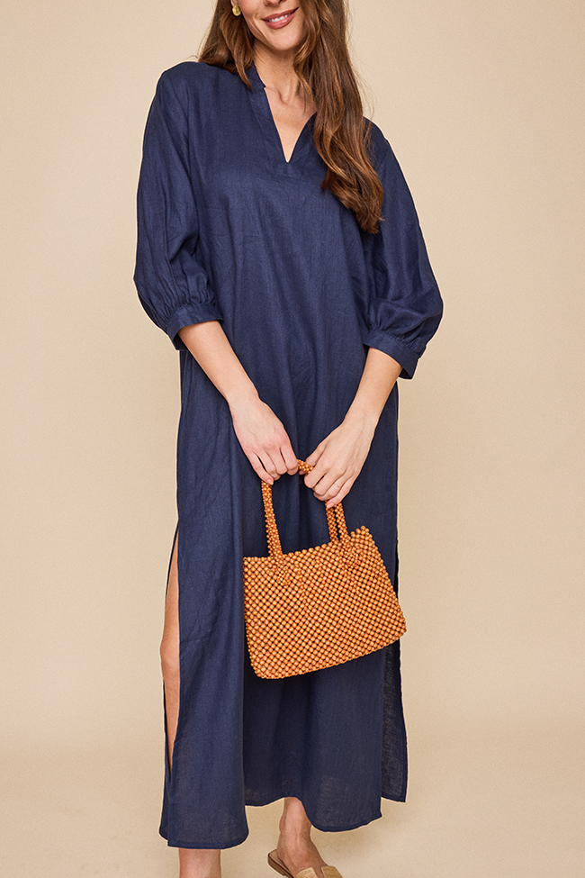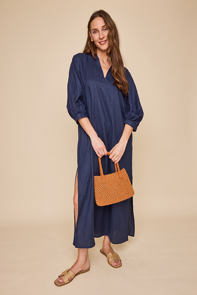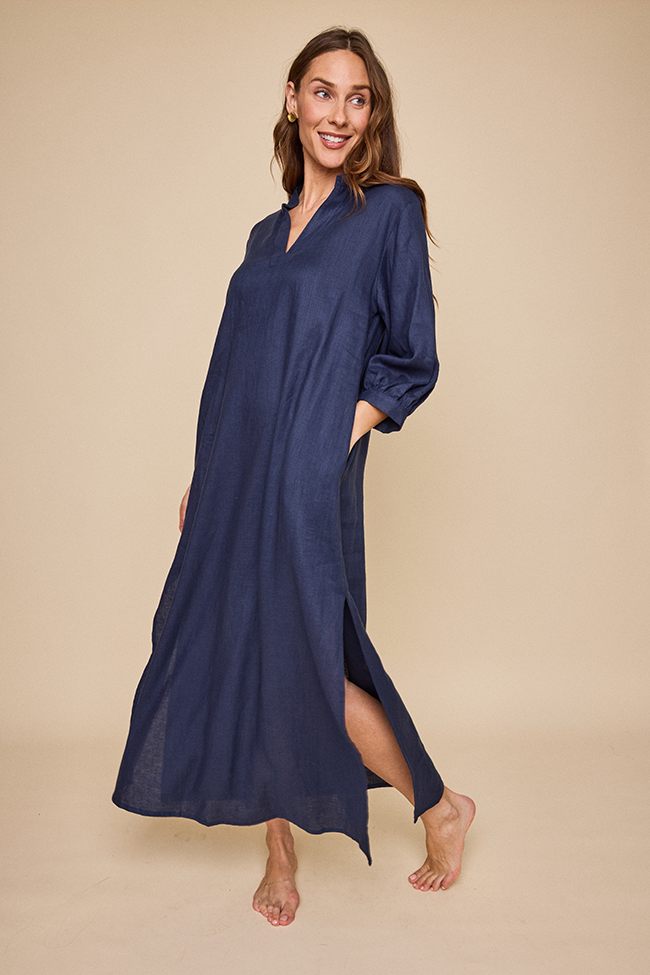 Introducing the Bishop Sleeve Kaftan, the latest gem in our collection. With its statement three quarter length bishop sleeves and flowy design, it keeps you cool and chic all day long. The relaxed fit drapes beautifully, making it the go-to for a laid-back, airy look. This is a classic navy coloured linen that holds its shape and feels great. Wear it freshly pressed or loose and wrinkly and feel chic no matter what.